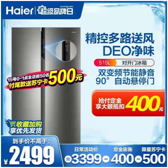 冰爽神器二:海尔515升对开门冰箱 抢付定金享400元大额抵扣