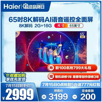 冰爽神器三:海尔65英寸全面屏电视付定金立减200,到手价2999元