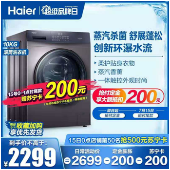 冰爽神器四:海尔10KG变频滚筒洗衣机返200元苏宁卡+定金抵扣,抄底价2299元
