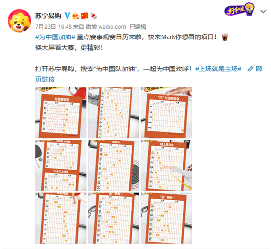 7月23日上午,苏宁易购发布奥运会重要夺金点的赛程日历,同时上线全新 “易起夺冠”专题会场, 呼吁大家“换大屏看大赛”,并推出了以旧换新至高500元的换新补贴,为中国奥运健儿加油助力!