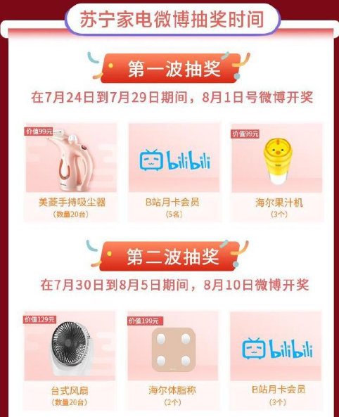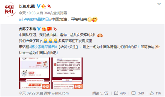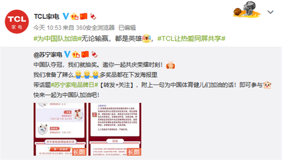与此同时,苏宁易购家电官方微博联手“818超燃联盟”成员,共同推出奥运期间特别活动,转发微博并附上为中国体育健儿加油的内容,苏宁易购家电将在8月1日、10日、15日、18日进行抽奖,期间将根据中国队获得金牌的数量,抽取相应的幸运用户N名,送出共同见证荣耀时刻。