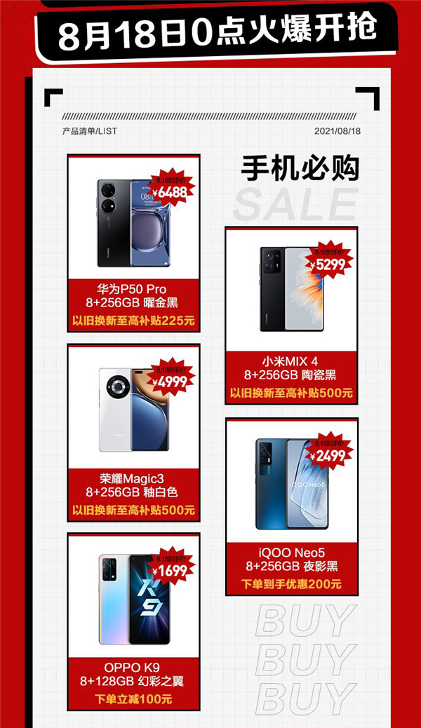 此外,采用高通骁龙870,性能超强的iQOO Neo5下单立减200元,到手价仅为2499元;65W超级闪充+6400万三摄的OPPO K9下单立减100元,到手价仅为1699元。同时,818期间,用户通过以旧换新购买新机,旧机回收价每满300元即补贴100元。