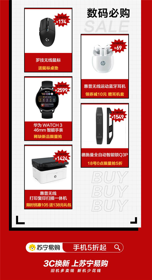 此次,苏宁易购电脑、数码同样也推出了可观的力度。德施曼全自动智能锁Q3P,到手价仅需1549元,18日零点更有五折抢购;惠普无线打印复印扫描一体机,限时优惠105元,到手价仅需1424元,还将赠送138元礼包;华为Watch3智能手表,稀缺新品限时抢购。