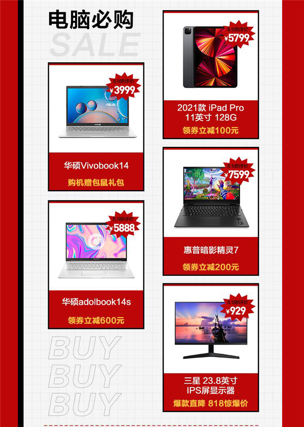 2021款iPad Pro,领券立减100元,到手仅需5799元;华硕Vivobook14,到手价仅需3999元,购机还将赠送包鼠礼包;惠普暗影精灵7,领券立减200元,到手价仅需7599元;华硕adolbook14s,领券立减600元,到手价仅需5888。参与电脑以旧换新,还有机会享受88折购机的福利优惠。