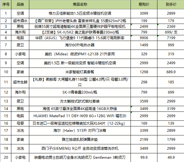 从曝光的爆品清单来看,苏宁易购集中力量整合了家电、家装、手机、快消等全品类资源,打造此次“99超惠买”大促。包含海信、海尔、创维、美的等品牌在内的家电、家装折扣力度较大,酒水、大闸蟹等时令消费品降价明显。
