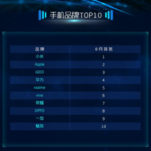 据苏宁易购8月手机消费大数据显示,小米、Apple、iQOO、华为、realme、vivo、荣耀、OPPO、一加、魅族成为当月销售业绩最好的十个品牌,这个排名也基本和大盘相吻合。