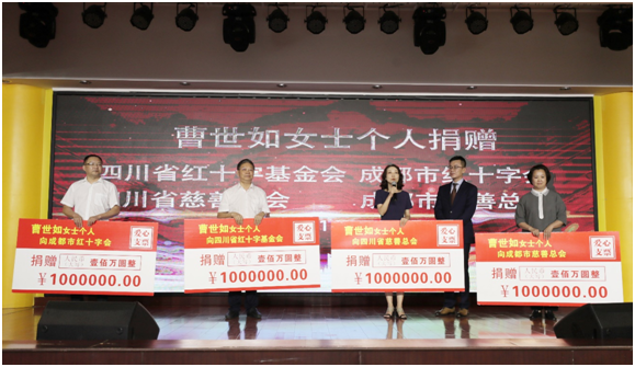 活动上,红旗连锁党委书记、董事长、总经理曹世如个人向四川省红十字基金会、四川省慈善总会、成都市红十字会、成都市慈善总会各捐赠100万元,用于社会公益慈善事业;同时,曹世如董事长个人向红旗连锁帮困互助基金捐赠30万元,同时将她个人此次50%分红的1200余万元用于员工分享。红旗连锁党委副书记、副董事长、董秘曹曾俊代表公司全体员工向四川省残疾人福利基金会、成都市残疾人福利基金会共捐赠71万余元,助力残疾人公益事业发展。