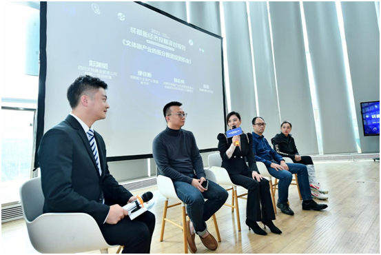 在圆桌论坛环节,四川文投基金管理公司投资一部总经理彭渊韬,成都数字文创产业联盟秘书长缪佳晰,成都区块链产业应用联盟发起人、成都创元世纪科技公司董事长郭乐林,第壹街舞品牌总监张琪共同讨论了文体旅产业的细分赛道投资机会。