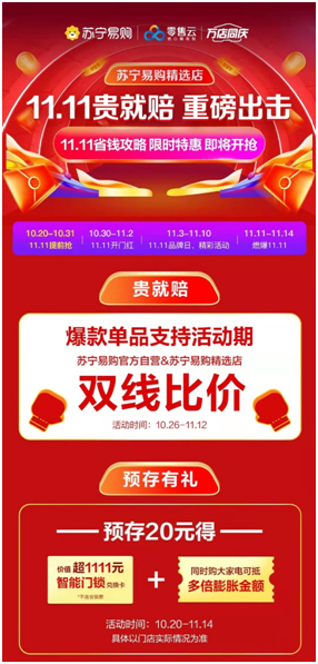 毫无疑问,“省钱”是每年双十一的关键词。据悉,双十一期间到店消费,零售云承诺活动期间买贵就赔,核心爆款产品,消费者可以在苏宁易购线上平台以及线下零售云门店双线比价。