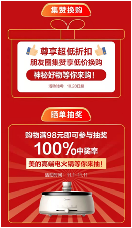 双十一期间,消费者在购物前,可以通过朋友圈集赞方式,以超低折扣购得精美好物;针对冰箱、洗衣机、空调、厨卫等大家电产品,苏宁易购零售云量身打造了价格低至19.9元的大家电主部件十年保;消费购物满98元,还能参与100%中奖率的晒单抽奖活动,赢取美的高端电火锅等超多好礼。
