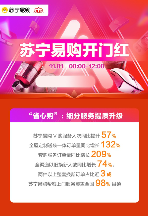 双11进入爆发期,服务持续升级,“省心购”消费升温。据悉,双11启动以来,苏宁易购V购服务人次同比提升57%;苏宁易购物流全屋定制送装一体订单量同比增长132%,套购服务订单量同比增长209%;苏宁易购全渠道以旧换新人数同比增长74%,两件以上整套换新订单占比近3成。