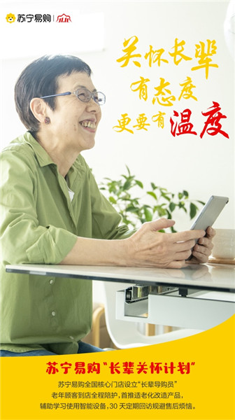 “老年顾客的服务要有态度,更要有温度。”据苏宁易购服务管理人员介绍,“长辈导购员”在自营和销售督导中通过考核选任,具备过硬的产品知识和服务经验,将围绕老年顾客到店陪护,适老化改造产品推荐,辅助学习使用智能设备和30天定期回访,提供可信任的逛购服务。“苏宁易购全国门店全体店员,也会主动为50岁以上长辈,提供健康码申领、网购车票、互联网购物、聊天工具使用等到店咨询。”