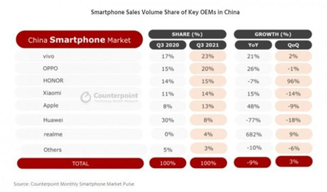 而国内手机市场方面,权威调研机构Counterpoint Research指出,Q3也因为零部件短缺及一些政策性因素影响出现了几家欢喜几家愁的局面。从品牌来看,vivo以23%的份额位列第一,OPPO以20%的份额位列第二,荣耀以15%的份额重返第三,而小米滑落至第四位。