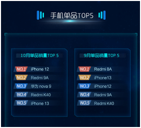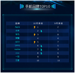 从10月数据看,和9月苏宁易购平台整体大致相同,销售业绩最好的前十名品牌与9月一致,只是名次发生了些许变化,分别是Apple、小米、华为、荣耀、iQOO、OPPO、realme、vivo、一加、三星。