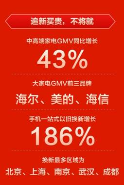 数据显示,11日前30分钟,苏宁易购中高端家电走俏,销售同比增长43%,海尔、美的、海信成为大家电销售Top3品牌。绿色循环理念下,3C品类呈现“消费升级,碳排降级”趋势,手机一站式以旧换新同比增长186%,其中换新最多的区域为北京、上海、南京、武汉、成都。