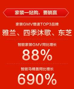 家电热销带动家装走俏,数据显示,双十一消费者偏爱家装家电一站购,家装销售增速TOP3品牌为雅兰、四季沐歌、东芝。全屋智能成“造家”新势力,智能家装销售同比增长88%,其中智能马桶盖同比增长690%。
