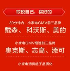 伴随悦己消费崛起,苏宁易购小家电消费呈现品质化趋势。30分钟内,戴森、科沃斯、美的成为“精致”用户最青睐的销售Top3小家电品牌,奥克斯、志高、添可位列增速最快品牌前三。