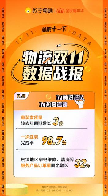 今年双十一,苏宁易购送装一体服务范围从331城扩展为覆盖全国所有地级市及超95%县级市,家装发货量实现同比增长3倍,一次送装完成率提升到98.7%。更快的送货速度、更广的覆盖范围、快速敏捷的服务能力,让苏宁易购在下沉市场握有更多筹码。