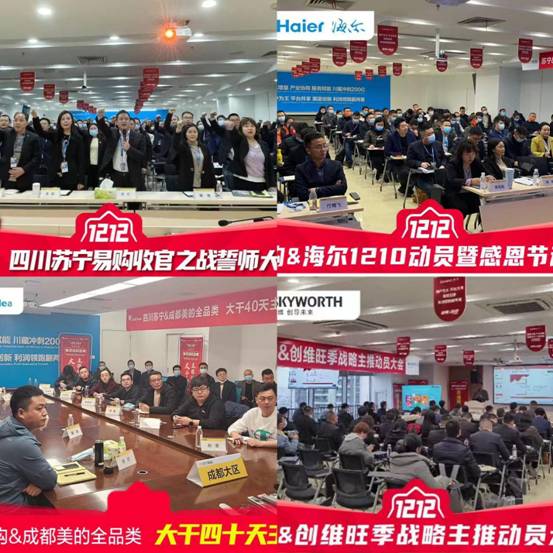 同时,11月30日,为提前筹备这场“年终省典”,四川苏宁易购召开双12动员会,所有门店店长参与会议,表示要集中力量,重点突破,围绕产品和服务两大抓手,大干一个月,收官四季度,在满足四川消费者需求的同时,创造新的销售高峰。