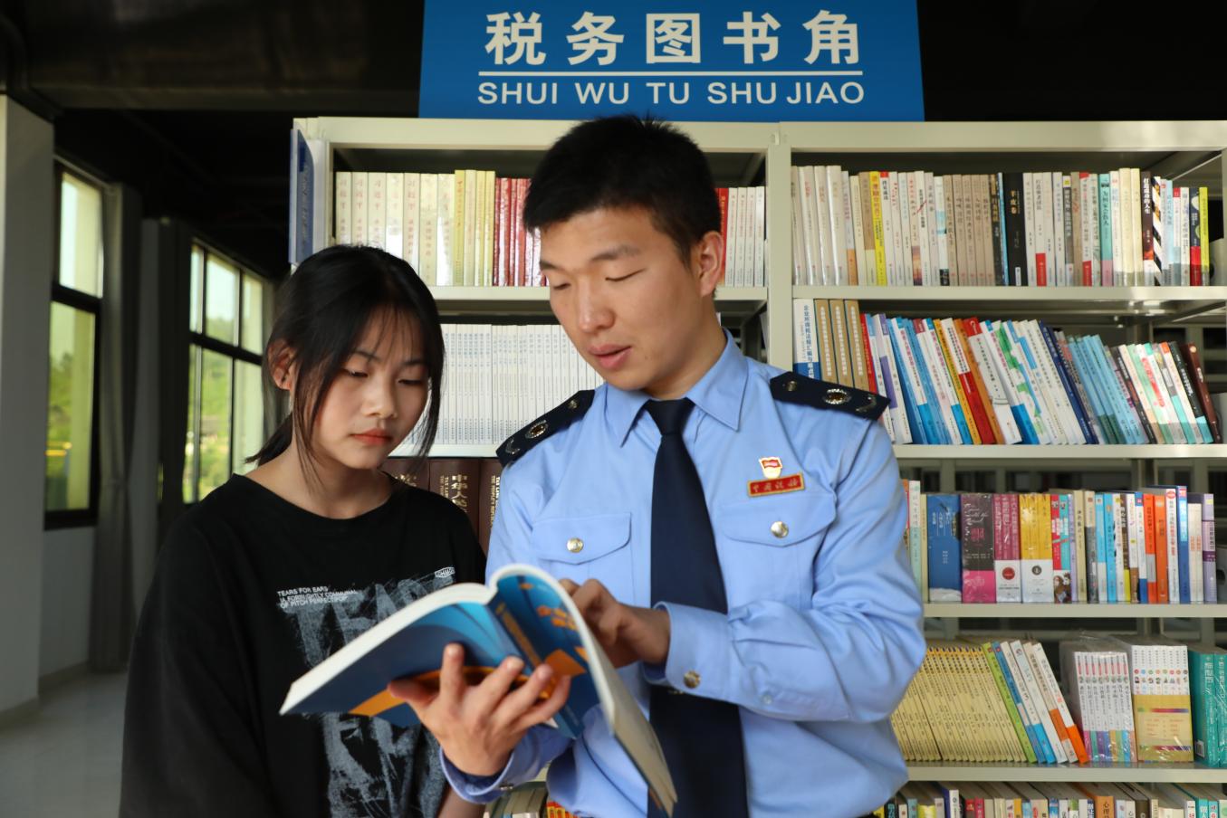 图为税务干部与同学在“税务图书角”阅读税务书籍
