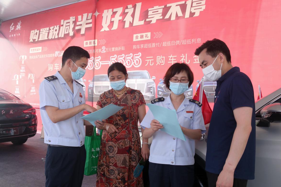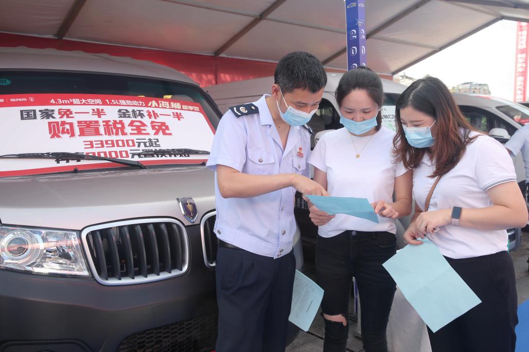“现在买车,不超过30万元的2.0升及以下排量乘用车,可以减半征收车辆购置税……”税务干部一边在提前设置好的税收政策咨询台为前来看车、购车的群众宣传政策,热情辅导纳税人通过电子税务局缴纳车辆购置税,一边走进车展中心,主动为过往群众发放《车辆购置税办税明白纸》,一对一讲解车辆购置税优惠政策。