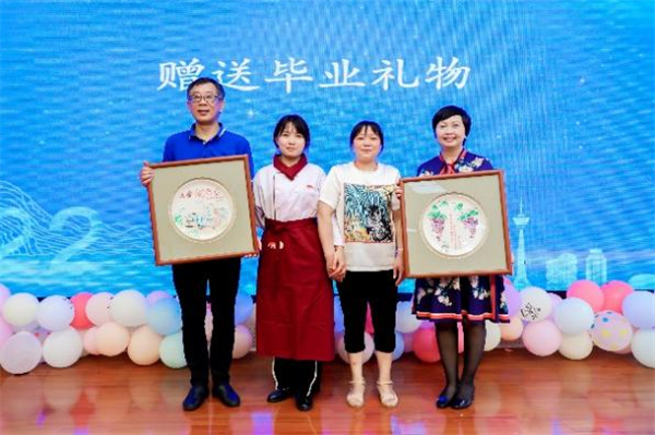 汪建平校长(左一)与李锦记中国企业事务总监赖洁珊女士(右一)接受希望厨师毕业纪念品