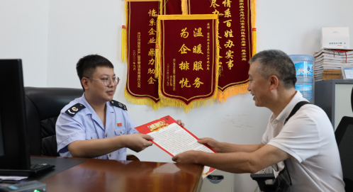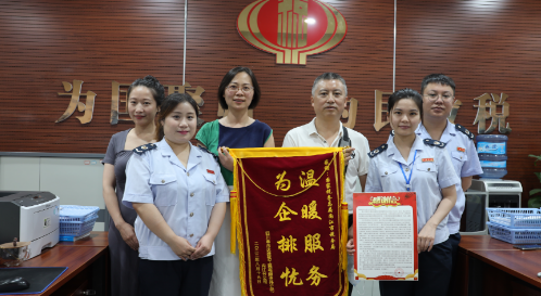 “我到办税服务厅都已经是下午5点50分,两位同志热情地接待我,让我们公司当天回款了300多万,救了急。但是,两位同志却等了我近一个小时,给大家添了麻烦,所以今天专门来送锦旗和感谢信。”李先生说。