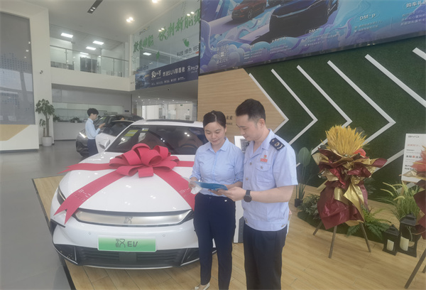 税务干部到遂宁市高新区比亚迪4S店宣传新能源汽车免征车辆购置税优惠延续政策