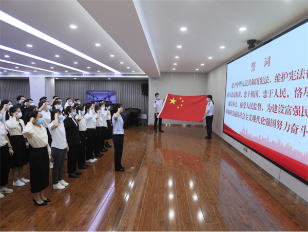 “我宣誓,忠于中华人民共和国宪法,维护宪法权威,履行法定职责,忠于祖国、忠于人民,恪尽职守、廉洁奉公,接受人民监督,为建设富强民主文明和谐美丽的社会主义强国努力奋斗!”,面对鲜艳的国旗,新录用公务员在领誓人带领下举起右拳庄严宣誓,铮铮誓言响彻会场,响亮喊出了新公务员们践行“忠诚担当、崇法守纪、兴税强国”这一中国税务精神的坚定信念。