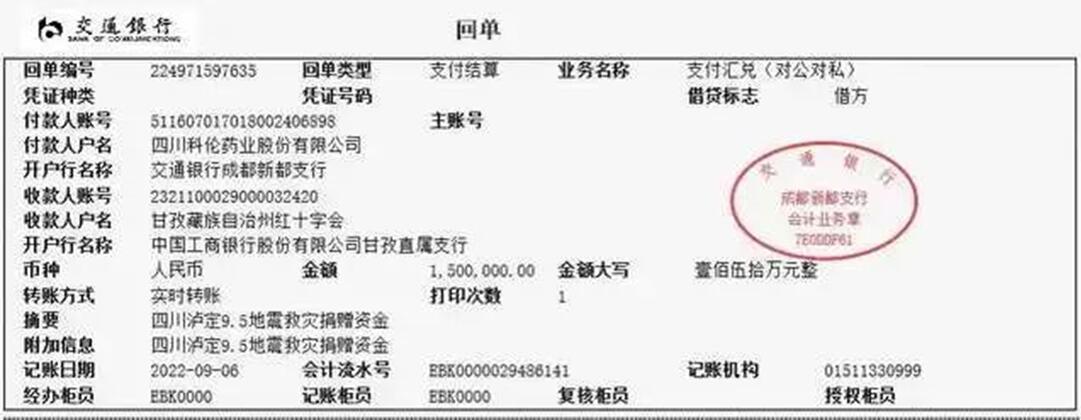 科伦药业相关负责人表示:“目前,我们正在争分夺秒抢时间,一方面紧急筹措物资,一方面密切对接捐赠甘孜州红十字会、雅安市红十字会渠道,以及办理相关通行证件。9月6日下午已经完成打款,预计明天早上物资能从成都出发。如有其他需要支持,我们也当全力以赴。”