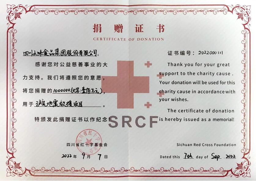 此时正值成都疫情管理静默期,接连遭遇高温限电、疫情封控,天味食品正处于闭环管理满负荷生产的紧张状态。然而灾情急迫,刻不容缓,同胞有难,八方支援!天味食品立刻召开紧急会议,通过四川省红十字基金会向泸定地震灾区捐款人民币100万元,用于地震紧急救援,过渡安置以及灾后重建。