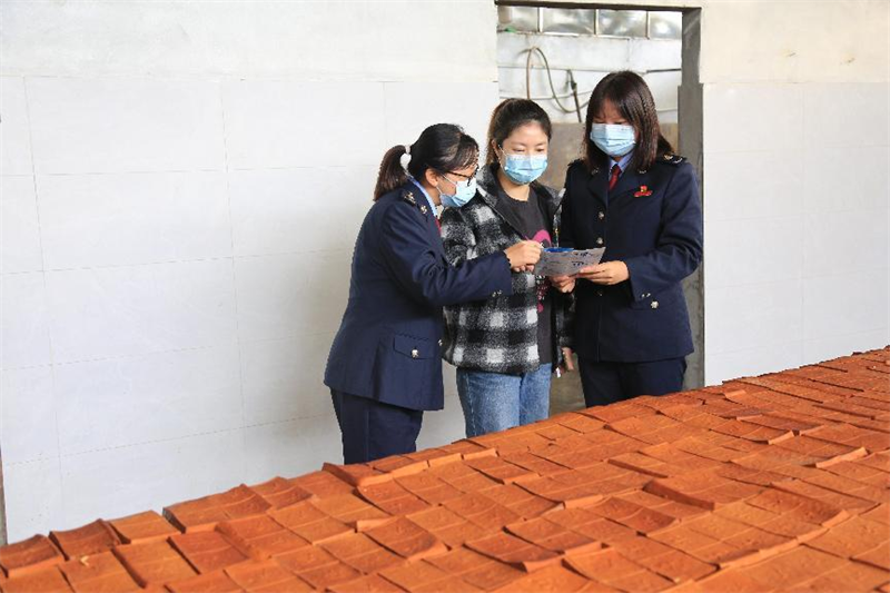 沙湾区税务局税务人员为乐山市沙湾区太平镇乐家豆制品加工厂送上税惠政策明白卡(摄影:黄洁茹)