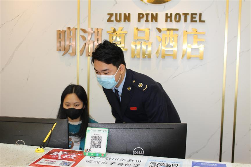 五通桥区税务局便民办税春风行动青年队到乐山市五通桥区尊品酒店辅导开具发票(摄影:李思慧)