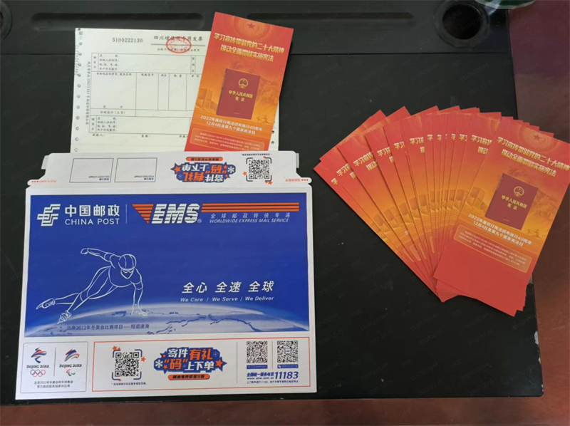 在泸州市税务局办税服务大厅发票寄递点,一份份装有宪法宣传册和税务发票的快递有序寄出