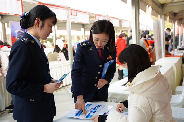 会场上,国家税务总局遂宁市税务局的税务干部,主动出击,现场为企业和前来应聘的求职人员提供涉税咨询服务,在为企业招贤纳士添助力,为返乡创业人员创业兴业架桥梁,一抹抹“税务蓝”穿梭在人群中,构成了一道道亮丽的风景。