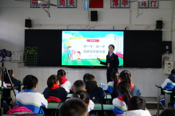 大英税务干部变身“老师”,上台就为大家带去一个字谜,充分调动学生们的学习热情。“称一半,说一半。打一个字。”当老师给出谜面后,同学们一下子兴趣盎然,纷纷举手作答。
