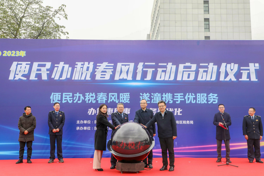 四川新闻网成都2月22日讯 便民春风如约至,税润新绿正当时。为扎实推进第10个便民办税春风行动,推动税收服务遂潼川渝毗邻地区一体化发展先行示范区建设,今(22)日上午,由国家税务总局遂宁市税务局、重庆市潼南区税务局主办,安居区税务局承办的2023年便民办税春风行动启动仪式在遂潼涪江创新产业园区举行。