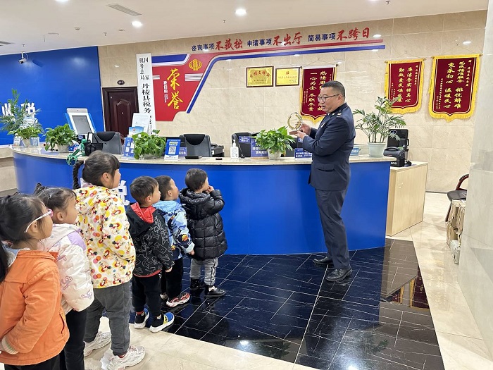 税务干部陈金强为小客人们送上一堂生动有趣的《身边税法小课堂》,从什么是税、为何征税、税收用途、依法纳税四个方面,以动画、图片、发票展示等相结合的方式,吸引小朋友投入课堂,让他们在潜移默化中接收税法知识,在温暖的“春风”中播下“依法诚信纳税”的希望种子。杨泓还带领孩子们到咨询导税台、自助办税区、综合服务窗口等参观了解,现场体验“远程办税”的便捷。“同学们”全神贯注,看得认真、听得仔细,徜徉在税法知识海洋里,开启了税法“新世界”。参观结束后,就到了有奖问答环节,小朋友们踊跃举手,用稚嫩的声音展示着自己的学习成果,一问一答间,希望的种子在孩子们的心中悄悄萌芽。