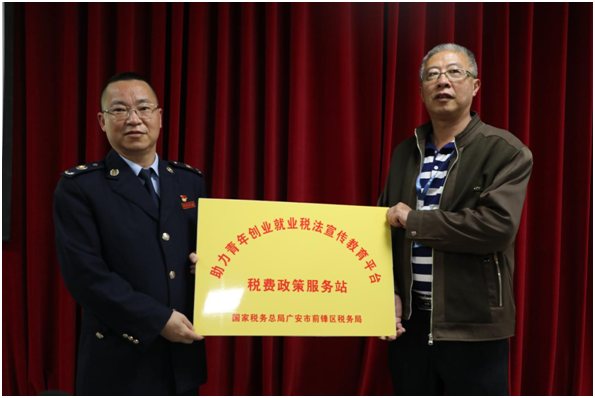 芳菲四月天,人间仲春时。4月12日,前锋区税务局助力青年创新创业政策宣讲暨“税费政策服务站”揭牌仪式在广安世纪职业技术学校举行。