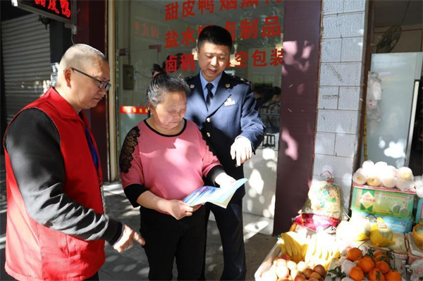 峨眉山市税务局工作人员同社区干部宣传“门前五包”及税收政策