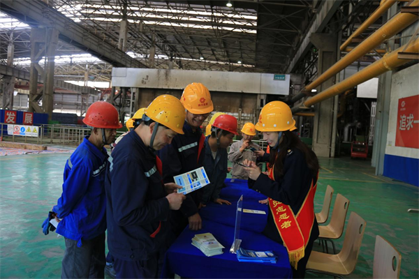 沙湾区税务局“税宣青年服务队”在企业搭建“钢铁工人临时服务专窗”,提供税费政策咨询和操作辅导