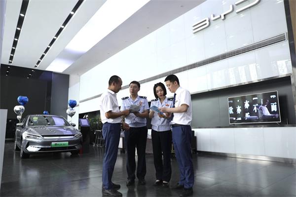 内江经开区税务干部在比亚迪4S店内向消费者解读新能源汽车延续免征车购税和新增免税名录,