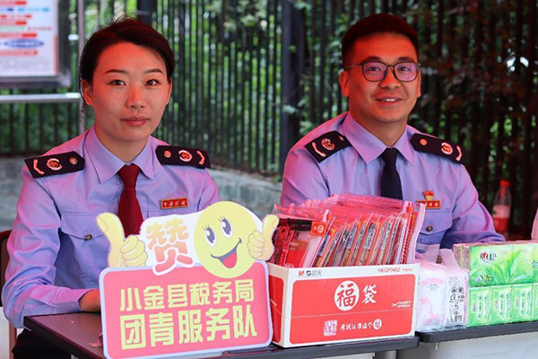 搭建帐篷,张贴标语,摆放物品……早晨7时许,小金县税务局“团青服务队”队员们已在考点外搭建好助考服务站,桌上整齐的摆放着免费为考生及家长们提供的巧克力、纸巾、文具、矿泉水和应急药品等暖心物资,为考场外翘首以盼的家长们提供了遮阳避雨的临时休息点。