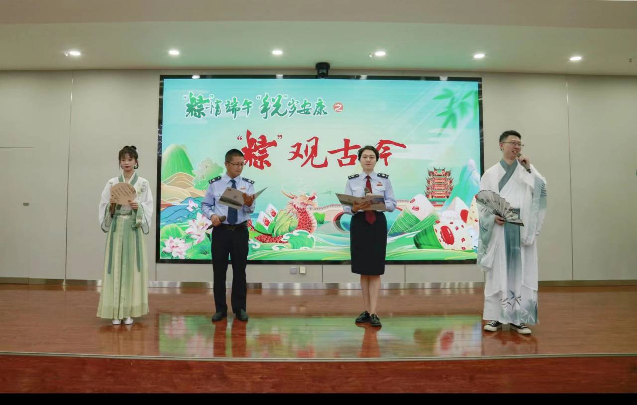 活动在“‘粽’观古今”“离骚•税月”诗词朗诵中拉开序幕,职工代表以古今对话的形式诵读屈原经典诗词和职工原创现代诗,实现传统文化与现代文化的对话与碰撞。干部职工在“路漫漫其修远兮,吾将上下而求索”中,共同追忆“亦余心之所善兮,虽九死而其犹未悔”的爱国主义精神内涵,在涵养家国情怀中凝聚民族精神,汇聚磅礴力量,不断勉励税务干部在税收现代化新征程上踔厉奋发、笃行不怠。