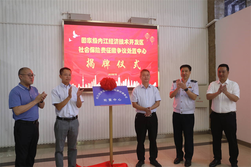 四川新闻网成都7月19日讯 7月18日,全省首家“社会保险费征缴争议处置中心”在内江经开区税务局甜城大道办公区挂牌成立。据悉,该中心由税务、人社、医保、镇(街)等部门共同发起成立,旨在全方位打通部门间联调联处渠道,实现社保费征缴争议“一站式”受理、“一揽子”处理,有效解决缴费人“多头跑”“多次跑”等问题。