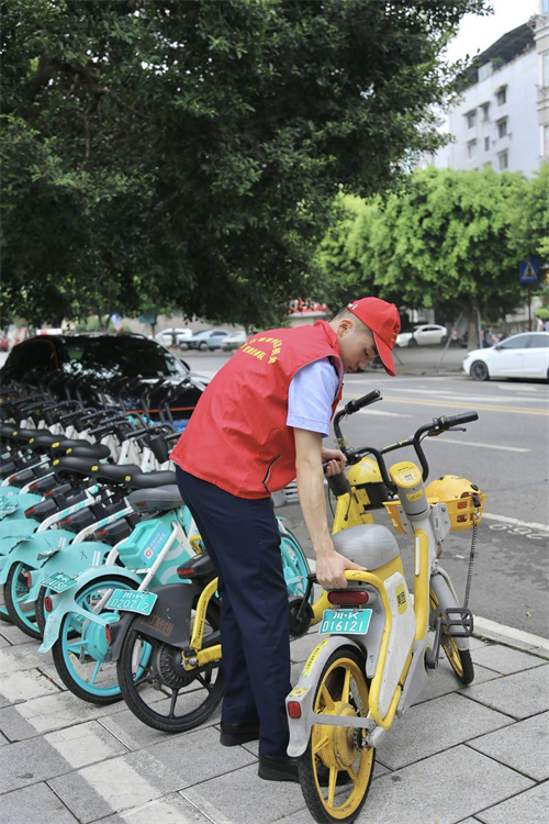 炎炎夏日,骄阳似火,刺眼的阳光下看见一群红色的身影在忙碌着,汗水早已将衣服打湿。他们是内江市市中区税务局的志愿者,头戴小红帽,身着红马甲,挪开违规摆放单车,整理无序摆放单车,维护干净整洁的内江市容市貌。这是便捷出行的“最后一公里”,也是走近文明的“第一步”。