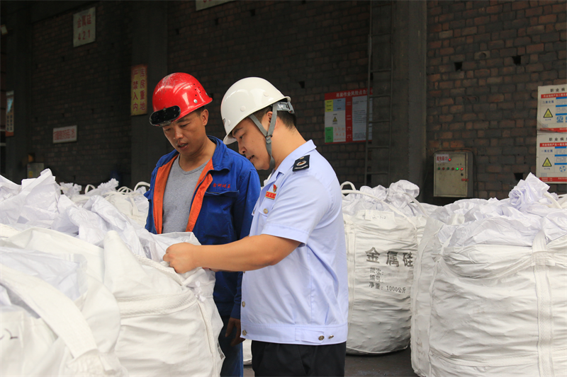 四川晶源硅业有限公司车间人员为峨边税务干部介绍金属硅产品 摄影:赵婧晔