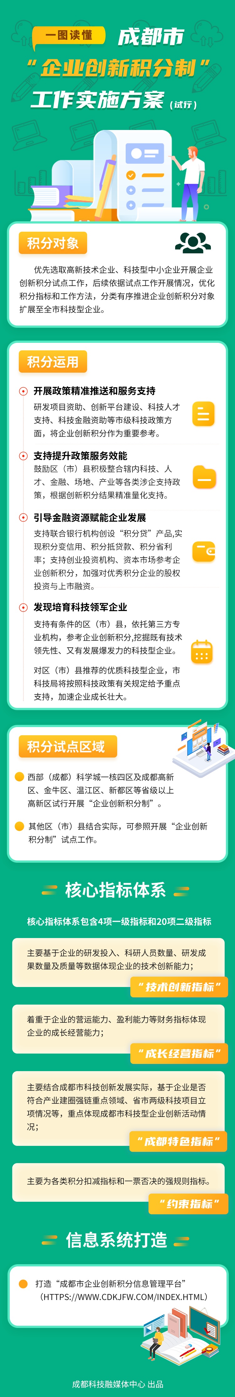 《方案》中明确,成都生产力促进中心以“科创通”-成都科技创新云平台为基础,打造“成都市企业创新积分信息管理平台”(https://www.cdkjfw.com/index.html)。据了解,该平台实现企业创新积分数据汇通、创新能力画像、指标数据统计分析、创新积分一键生成等全流程线上操作功能,做到全过程可查询、可追溯。另外,《方案》也提出,区(市)县结合实际,自主开发建设企业创新积分信息管理平台。