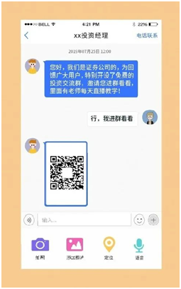 诈骗分子伪冒证券公司工作人员,通过电话、微信、QQ等方式联系你,以免费投资教学为由,添加好友,并邀请你进入“免费”的投资交流群。进群后,数十个人的群里,可能除了你都是骗子。