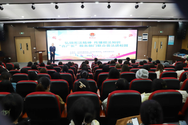 税法宣传进高校有助于引导大学生顺利开启就业创业“第一道门”。12月1日,在重庆对外商贸学院的演播厅,来自重庆市合川区税务局、长寿区税务局以及四川省广安市税务局的“合广长”税法宣讲团讲授的“就业创业税法第一课”引发同学们高度关注。